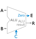 Use the functionality you built in Part 1 to build a 32-bit ALU. The interface should look like the following. Inputs a and b are 32-bit vectors, c is a 5-bit control input vector, r is the 32-bit output vector, e is a 1-bit output which is set if and only if the result is zero.