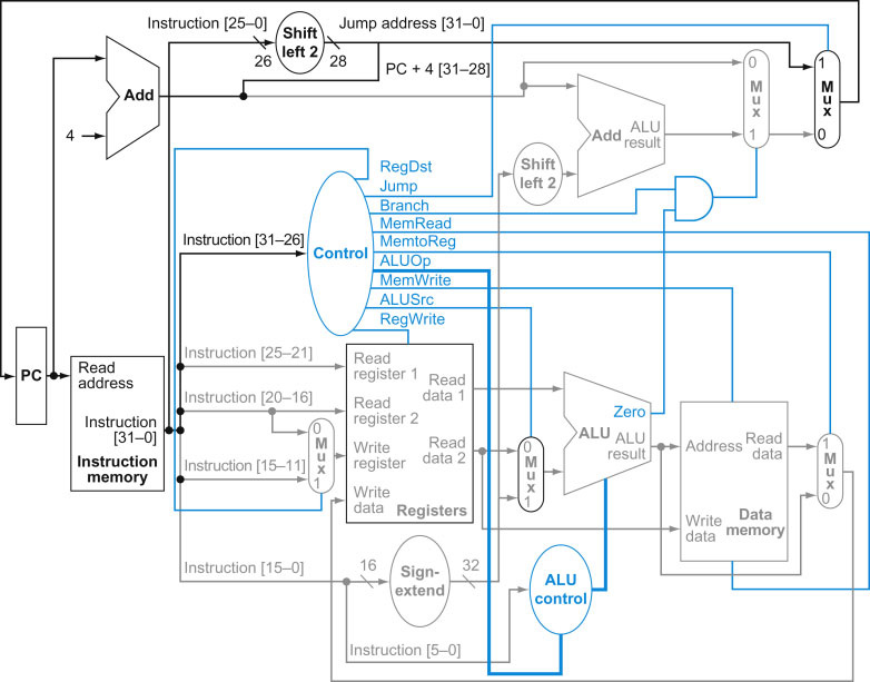 Put all the components from Parts 1-3 together to form a single-cycle MIPS CPU, as shown in the following diagram.